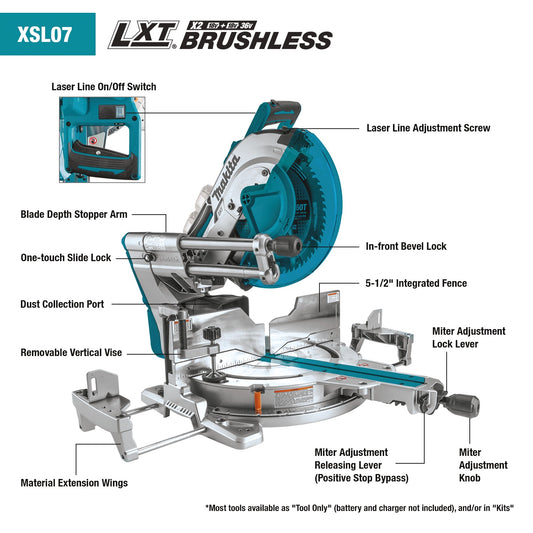 Makita XSL07Z 36V (18V X2) LXT® Brushless 12" Dual‑Bevel Sliding Compound Miter Saw with Laser, Tool Only