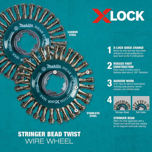 Makita D-72659 X‑LOCK 4‑1/2" Carbon Steel Stringer Bead Twist Wire Wheel