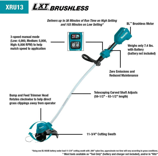 Makita XRU13Z 18V LXT® Lithium‑Ion Brushless Cordless Curved Shaft String Trimmer, Tool Only