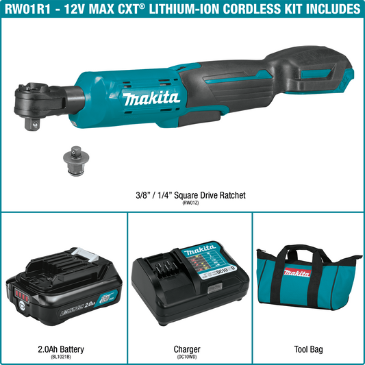 Makita RW01R1 12V max CXT® Lithium‑Ion Cordless 3/8" / 1/4" Sq. Drive Ratchet Kit (2.0Ah)