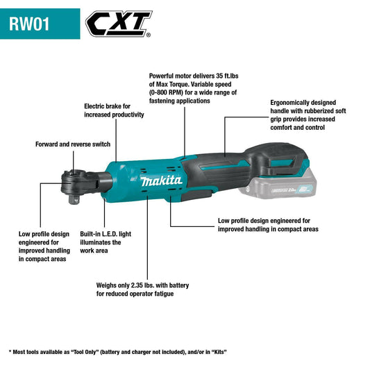 Makita RW01Z 12V max CXT® Lithium‑Ion Cordless 3/8" / 1/4" Sq. Drive Ratchet, Tool Only