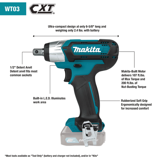 Makita WT03Z 12V max CXT® Lithium‑Ion Cordless 1/2" Sq. Drive Impact Wrench, Tool Only