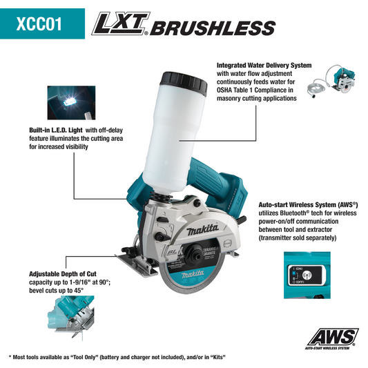 Makita XCC01Z 18V LXT® Lithium‑Ion Brushless Cordless 5" Wet/Dry Masonry Saw, AWS® Capable, Tool Only