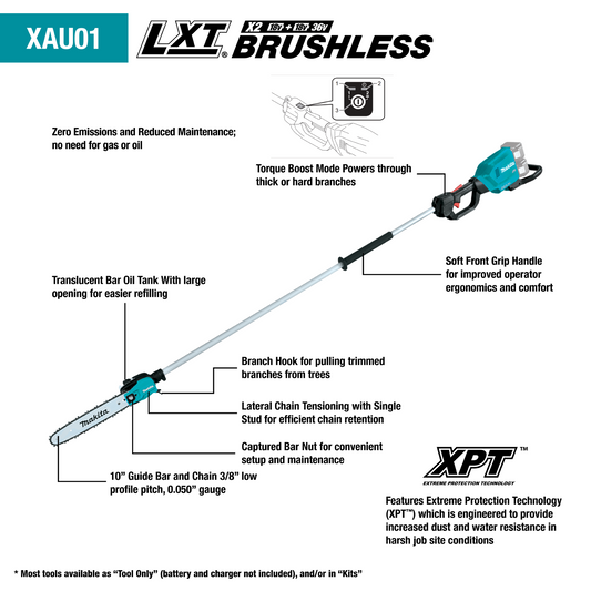 Makita XAU01ZB 36V (18V X2) LXT® Brushless 10" Pole Saw, 8' Length, Tool Only