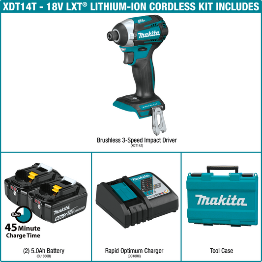 Makita XDT14T 18V LXT® Lithium‑Ion Brushless Cordless Quick‑Shift Mode™ 3‑Speed Impact Driver Kit (5.0Ah)