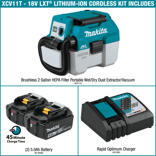 Makita XCV11T 18V LXT® Lithium‑Ion Brushless Cordless 2 Gallon HEPA Filter Portable Wet/Dry Dust Extractor/Vacuum Kit (5.0Ah)