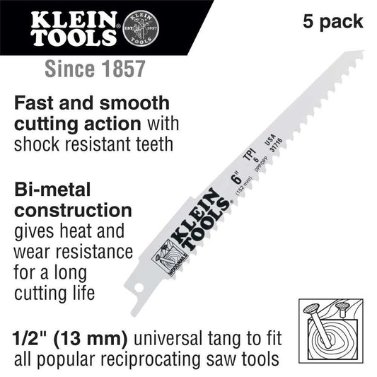 Klein Tools 31716 Reciprocating Saw Blades, 6 Tpi, 6-Inch, 5-Pack