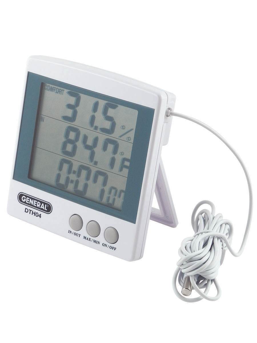 The #DTH04 In/Out Temperature-Humidity Monitor with Clock and Jumbo Display is ideal for walk-in refrigerators, reach-in boxes, greenhouses and household and lab applications.