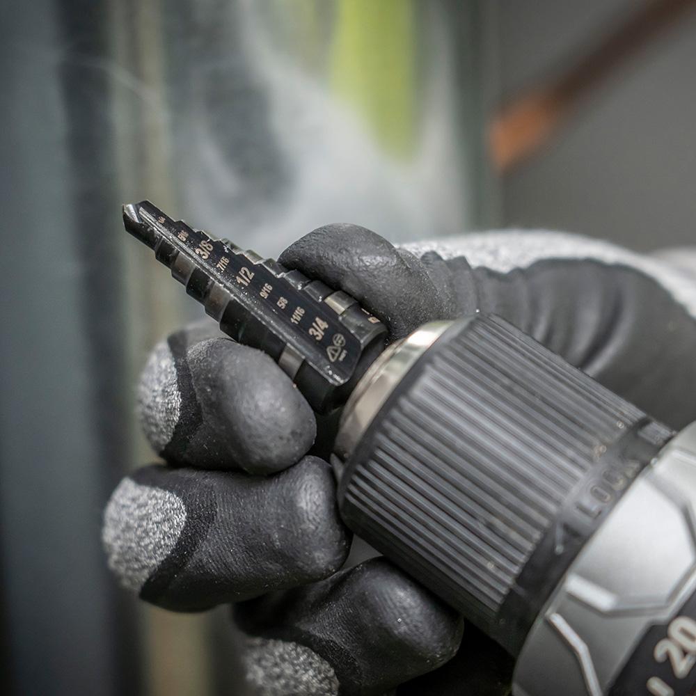 These Double-Fluted Step Drill Bits provide faster cutting and drilling than single flute bits. The easy-to-read step markings and targets save time when drilling holes. Thick 3/8-Inch hex shank provides a firm, positive grip and won't spin out in the drill.