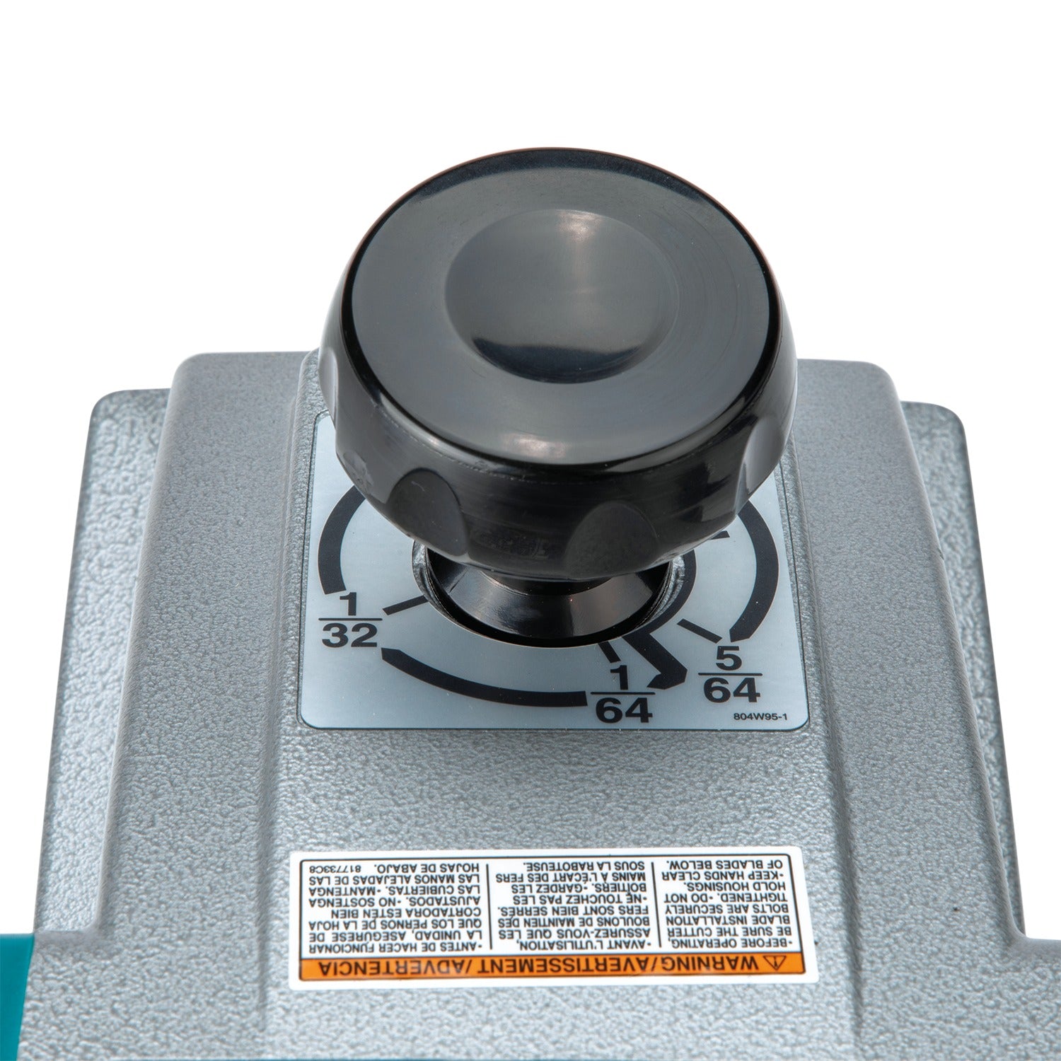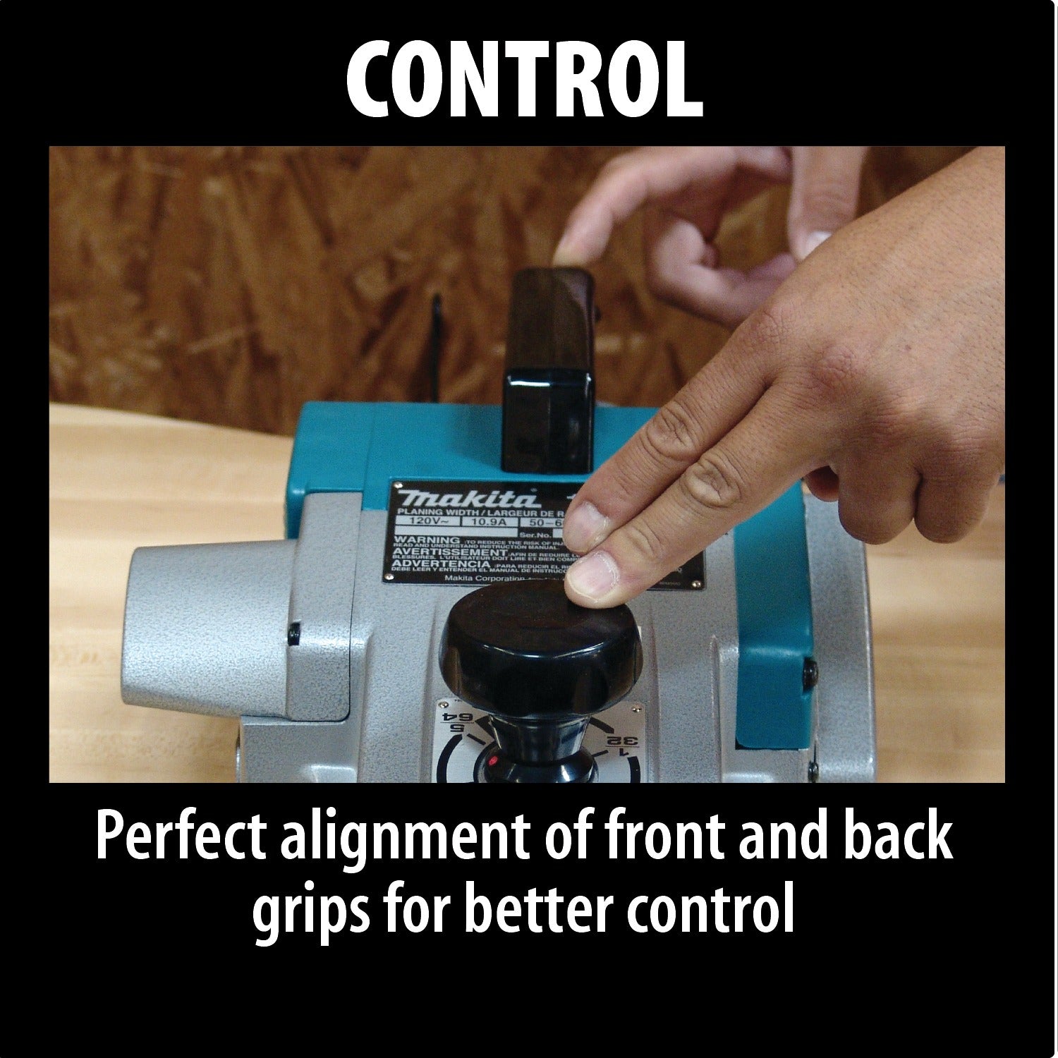 The Makita 1806 6-3/4 in. planer is unrivaled for sheer power, size, and performance. The 1806 features a powerful 10.9 AMP Makita-built motor that delivers 30,000 cuts per minute. It has a comfortable handle, easy depth settings, and a large and sturdy sole plate for added stability. Perfect alignment of front and back grips is engineered for balanced operation. For continuous operation, simply click the lock-on button. The Makita 1806B 6-3/4 in. double-insulated planer also features a machined aluminum base for precision.