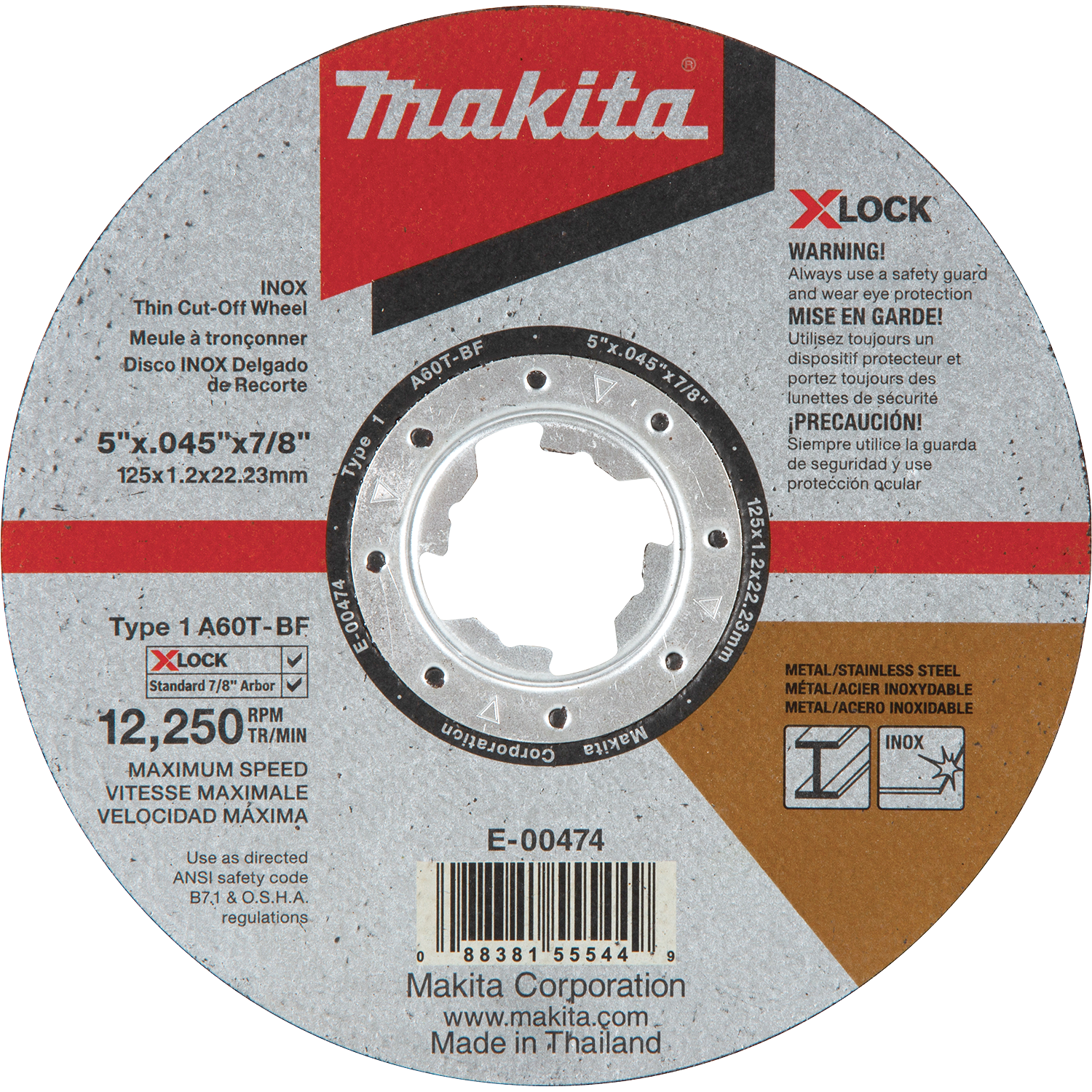 Makita E-00474 X‑LOCK 5" x .045" x 7/8" Type 1 General Purpose 60 Grit Thin Cut‑Off Wheel for Metal and Stainless Steel Cutting