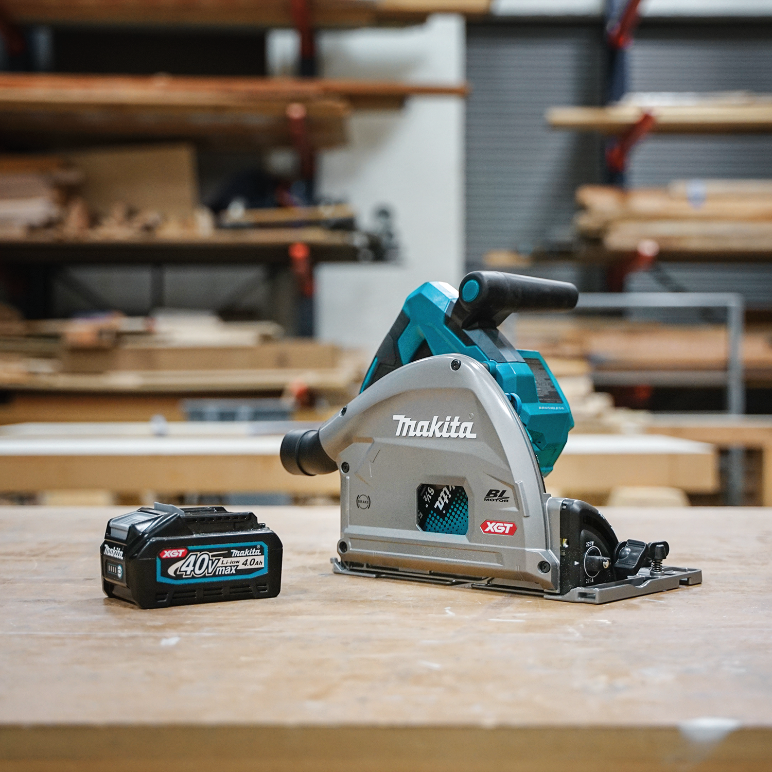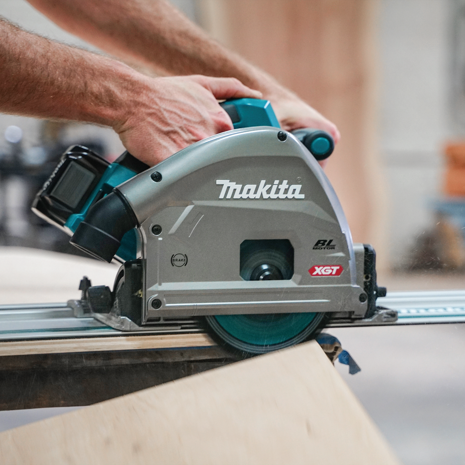 The 40V max XGT® Brushless 6-1/2” Plunge Circular Saw Kit (GPS01M1J) delivers precise and more accurate cutting when combined with an optional guide rail system (sold separately). The saw and rail system work together to produce accurate cuts with minimal tear-out. The saw combines a powerful Makita-built brushless motor with Automatic Speed Change™ Technology, which adjusts cutting speed and torque during the cut for optimum performance.The saw has a variable speed control dial (2,500 – 4,900 RPM), with soft start and an electric brake for added convenience. Constant speed control enables a consistent smooth finish under load. It has a large 2-3/16” cutting capacity at 90-degrees and 1-1/2” at 48-degrees. It has a bevel capability of -1° to 48° and positive stops at 22.5° and 45°.For improved efficiency, it is capable of wirelessly starting a connected dust management solution. Auto-start Wireless System (AWS®) utilizes Bluetooth® technology for wireless communication between the tool and dust extractor (sold separately). When the trigger of the AWS-equipped GPS01Z is engaged, the AWS-equipped dust extractor powers-up. When the trigger is released, the dust extractor powers-down. AWS is intelligent communication that eliminates cords and excessive noise since the dust extractor runs only when the tool is running. An AWS transmitter is needed (sold separately). XGT is a system of equipment, tools, batteries, and chargers utilizing 40v max lithium-ion batteries. XGT is engineered to deliver high power to take on high-demand applications, allowing users to completely transition to a cordless job site. XGT is equipped with advanced motor engineering, intelligent digital communication, and superior durability features to outpower, outsmart and outlast the rest.