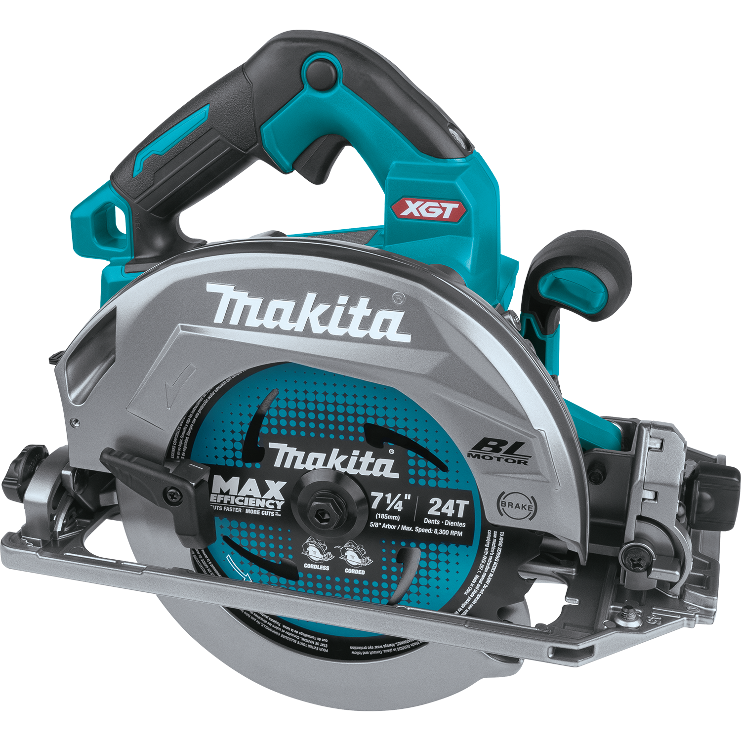 The 40V max XGT® Brushless 7-1/4” Circular Saw (GSH02Z, Tool Only) provides cordless convenience, while taking on high-demand applications. The Makita-built brushless motor delivers 6,000 RPM for high-speed cutting performance. It cuts 3X the material in a single pass with a large cutting capacity of 2-3/8” at 90-degrees. This saw is ideal for framers, builders, roofers, forming, and more. The convenient guide rail compatible base interacts with optional guide rails to provide dead-on, straight or bevel cutting without the need for an adapter. The GSH02Z offers 56-degrees bevel capacity with positive stops at 22.5-degrees, 45-degrees, and 56-degrees. The saw features an electric brake for maximum productivity, dual L.E.D. lights, and a die-cast magnesium base and blade guard, which combines durability with less weight.Automatic Torque Drive Technology adjusts cutting speed under load for optimum cutting performance. The saw is also equipped with Makita's Extreme Protection Technology (XPT™), is a series of integrated seals designed to improve a tool’s operation in harsh conditions by channeling water and dust from key internal components.Auto-Start Wireless System (AWS®) uses Bluetooth® technology for wireless power-on and power-off communication between the equipped tool and dust extractor. Once connected via AWS, the AWS-equipped dust extractor will automatically power on or off when the AWS-equipped cordless tool starts or stops, running only when the tool is in use. This increases productivity on a single charge and reduces continuous noise at the job or work site. XGT is a system of equipment, tools, batteries and chargers utilizing 40v max lithium-ion batteries. XGT is engineered to deliver high power to take on high-demand applications, allowing users to completely transition to a cordless job site. XGT is equipped with advanced brushless motor engineering, intelligent digital communication, and superior durability features to outpower, outsmart and outlast the rest.