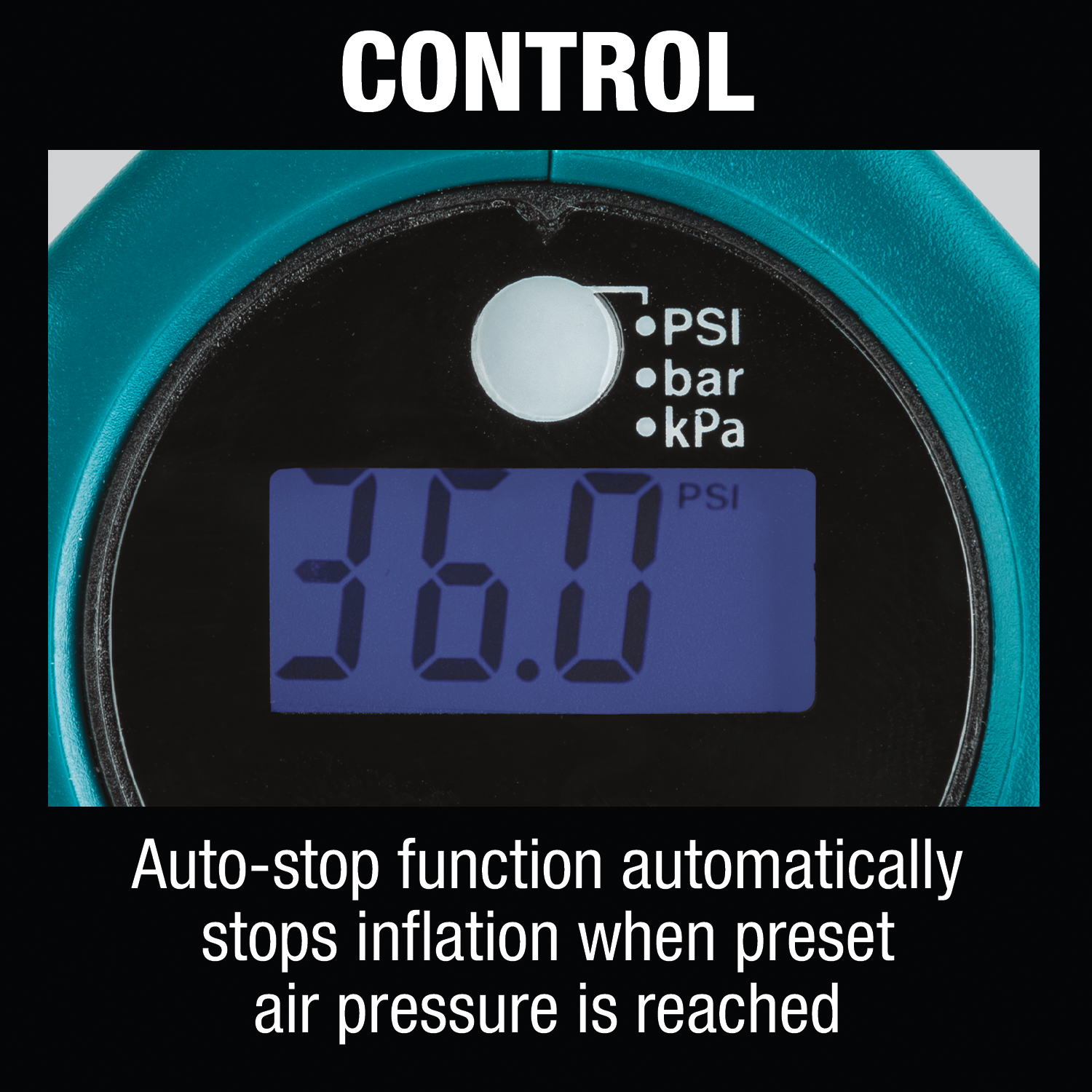• CONTROL : Auto-stop function automatically stops inflation when preset air pressure is reached