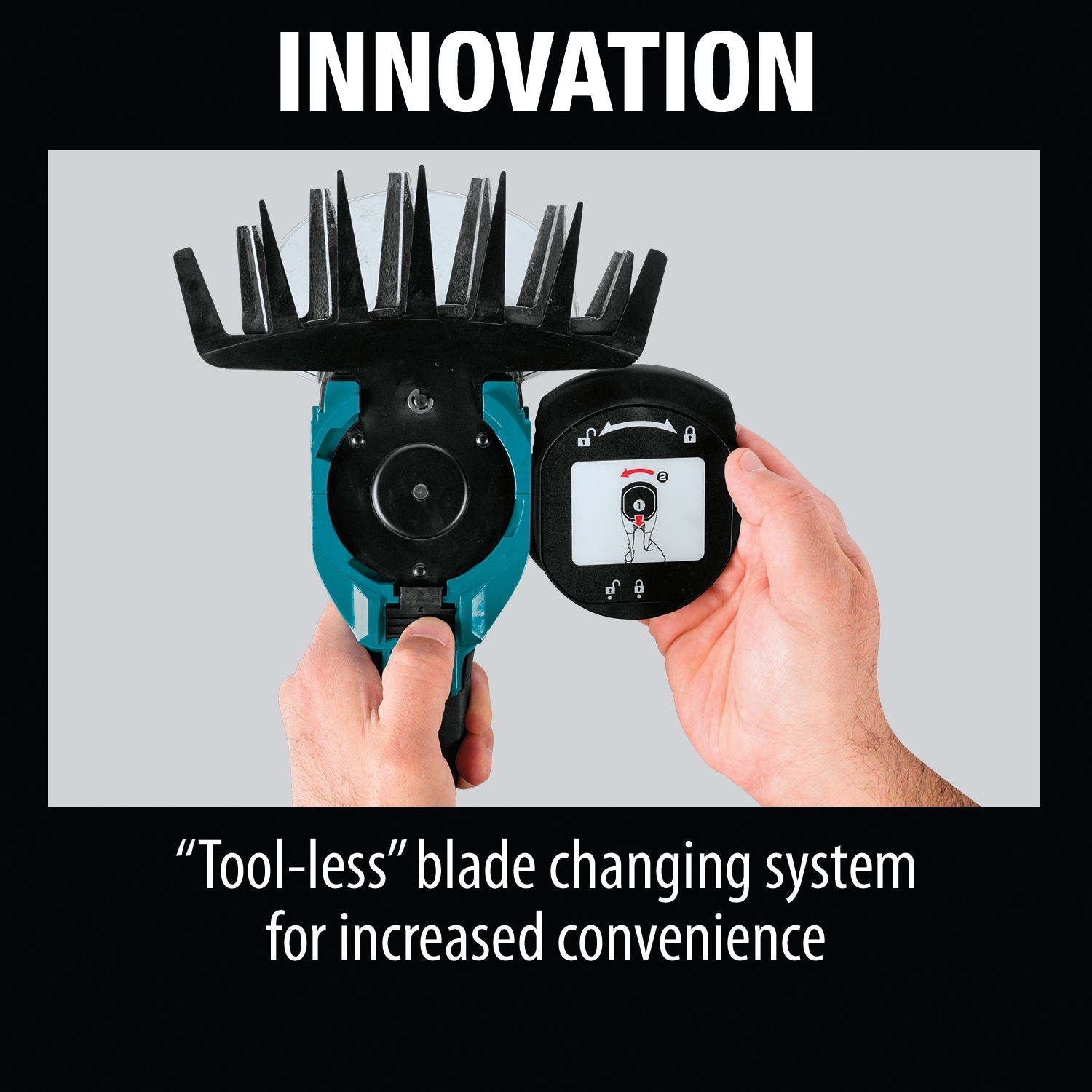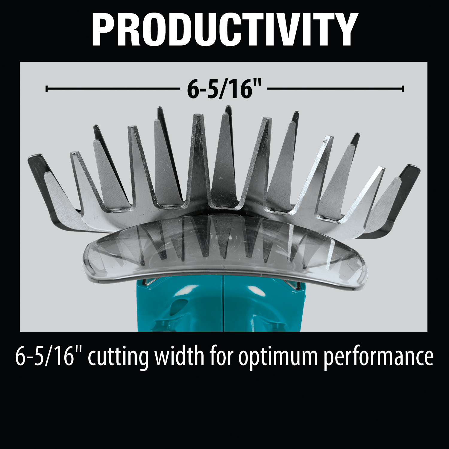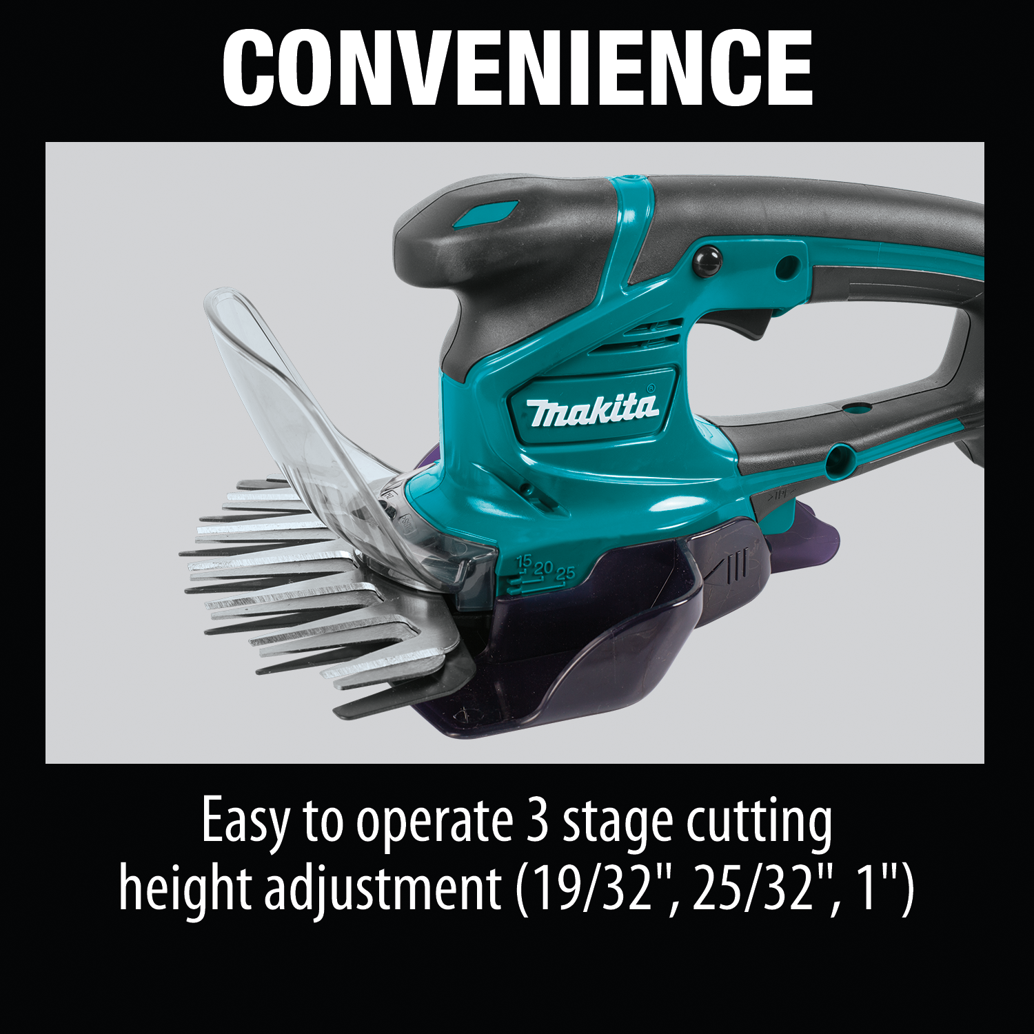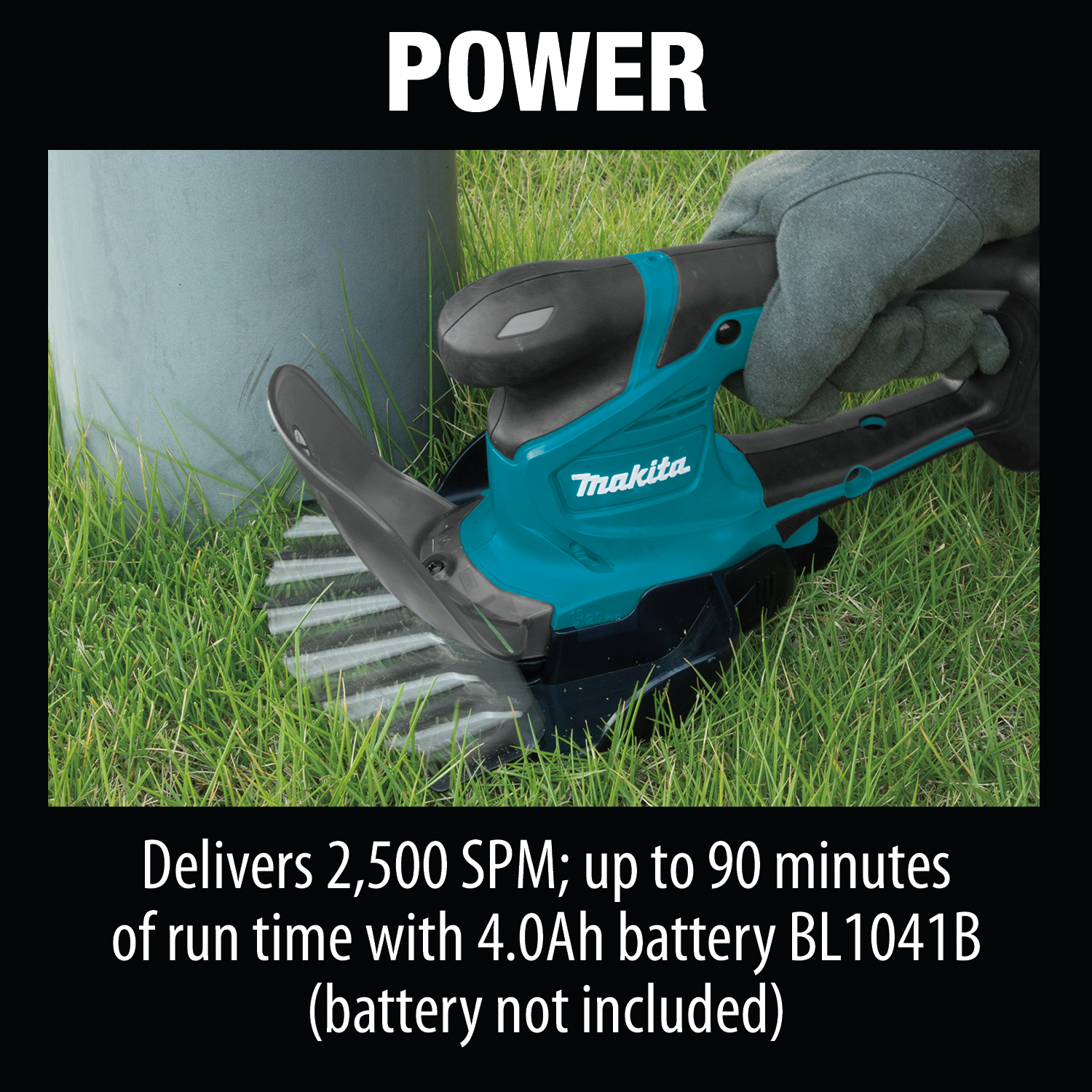 The Makita 12V max CXT® Lithium-Ion Cordless Grass Shear (MU04Z) is a portable and convenient for grass trimming and cutting. Compact and ergonomic, the Grass Shear has a full 6-5/16” cutting width and 2,500 strokes per minute (SPM) for efficient cutting. Convenience features include a “tool-less” blade change system and an easy to operate 3-stage cutting height adjustment. When using the 12V max CXT® 4.0Ah battery (sold separately), users get up to 90 minutes of run time. It’s part of the expanding 12V max CXT® series, combining performance with superior ergonomics in a compact size.