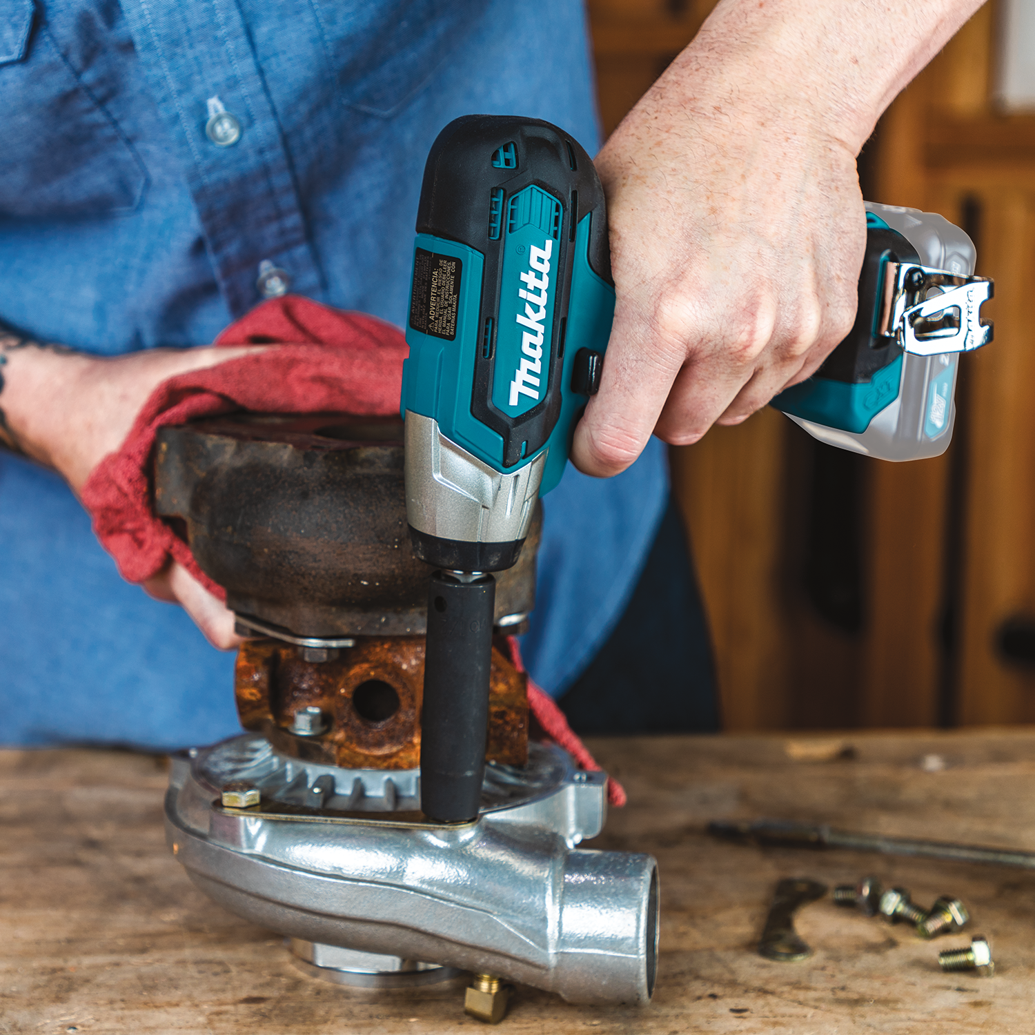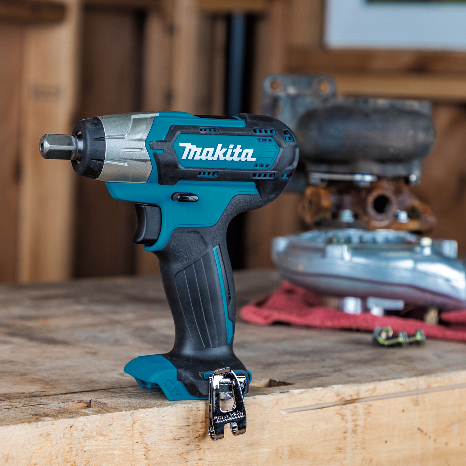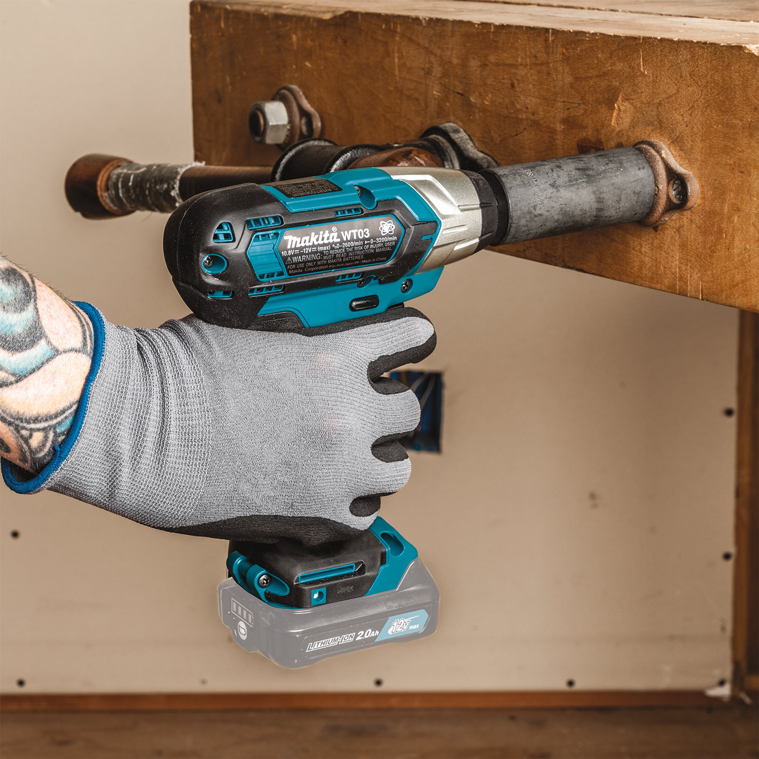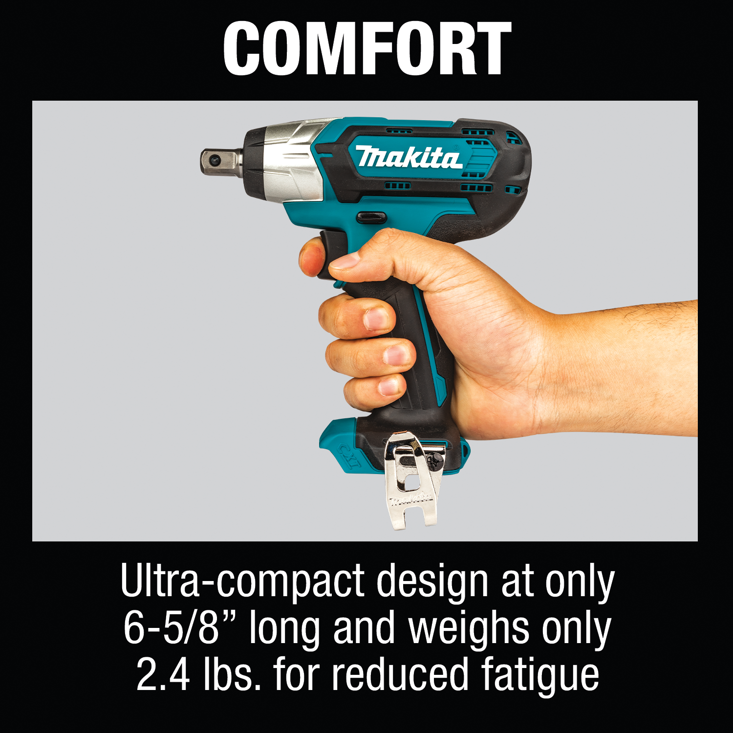The Makita 12V max CXT® Cordless 1/2” Impact Wrench, Tool Only (WT03Z) delivers power and speed in a compact size for efficient fastening. It is an ideal solution for working in tight spaces and overhead applications.With Makita 12V max CXT® Lithium-Ion slide-style batteries (sold separately), users get superior balance and ergonomics over pod-style batteries. For longer run time, 12V max CXT® cordless tools are also compatible with the 12V max CXT® Lithium-Ion 4.0Ah battery (BL1041B). 12V max CXT® Lithium-Ion batteries are engineered with a Battery Protection Circuit that protects against overloading, over-discharging and over-heating. It’s part of the expanding 12V max CXT® series, combining performance with superior ergonomics in a compact size.Makita’s entire line-up of impact drivers and impact wrenches including the WT03Z is engineered with a proprietary hammer and anvil impact mechanism that is manufactured using the best raw materials with the highest quality steel, as well as a unique heat-hardening process for maximum fastening and driving power.