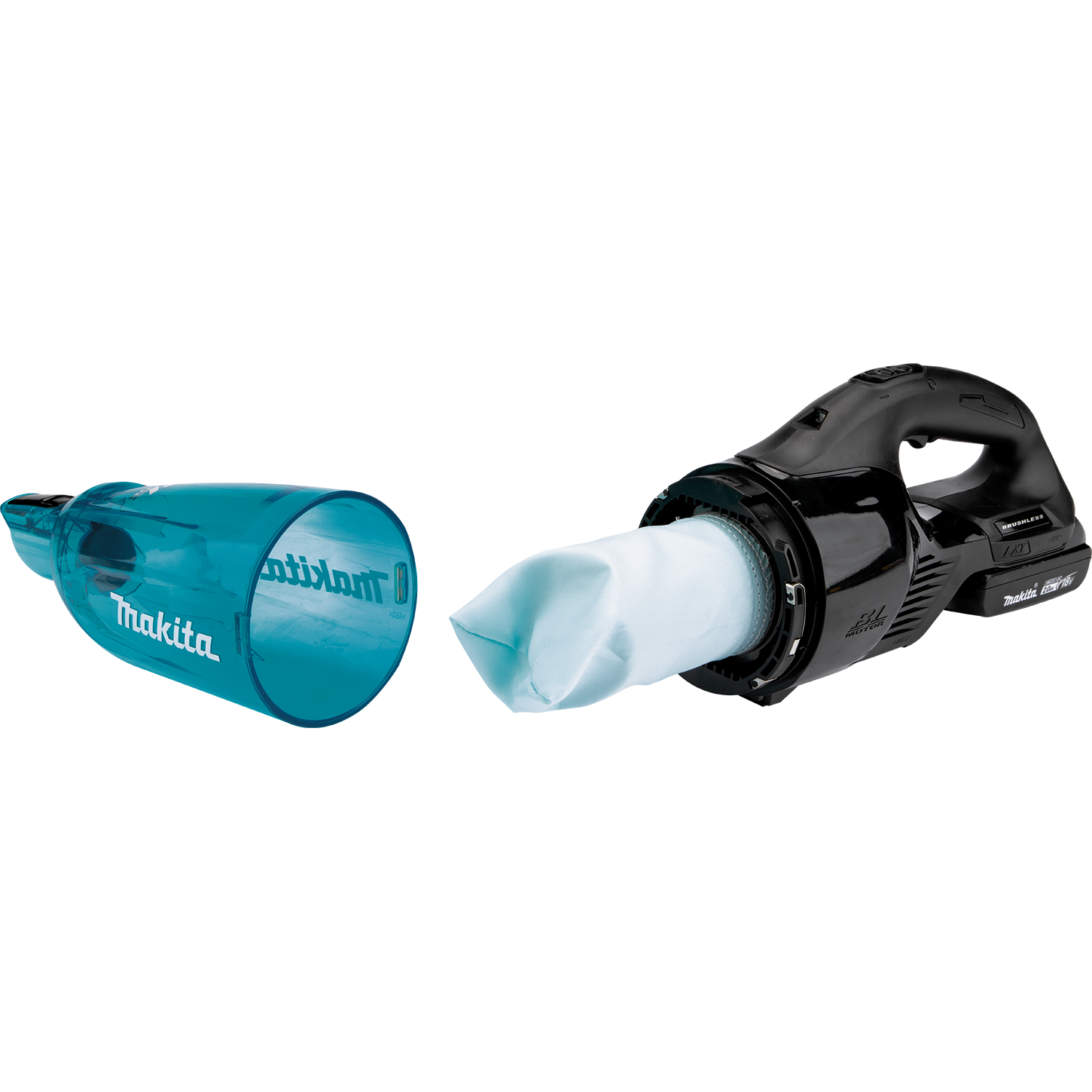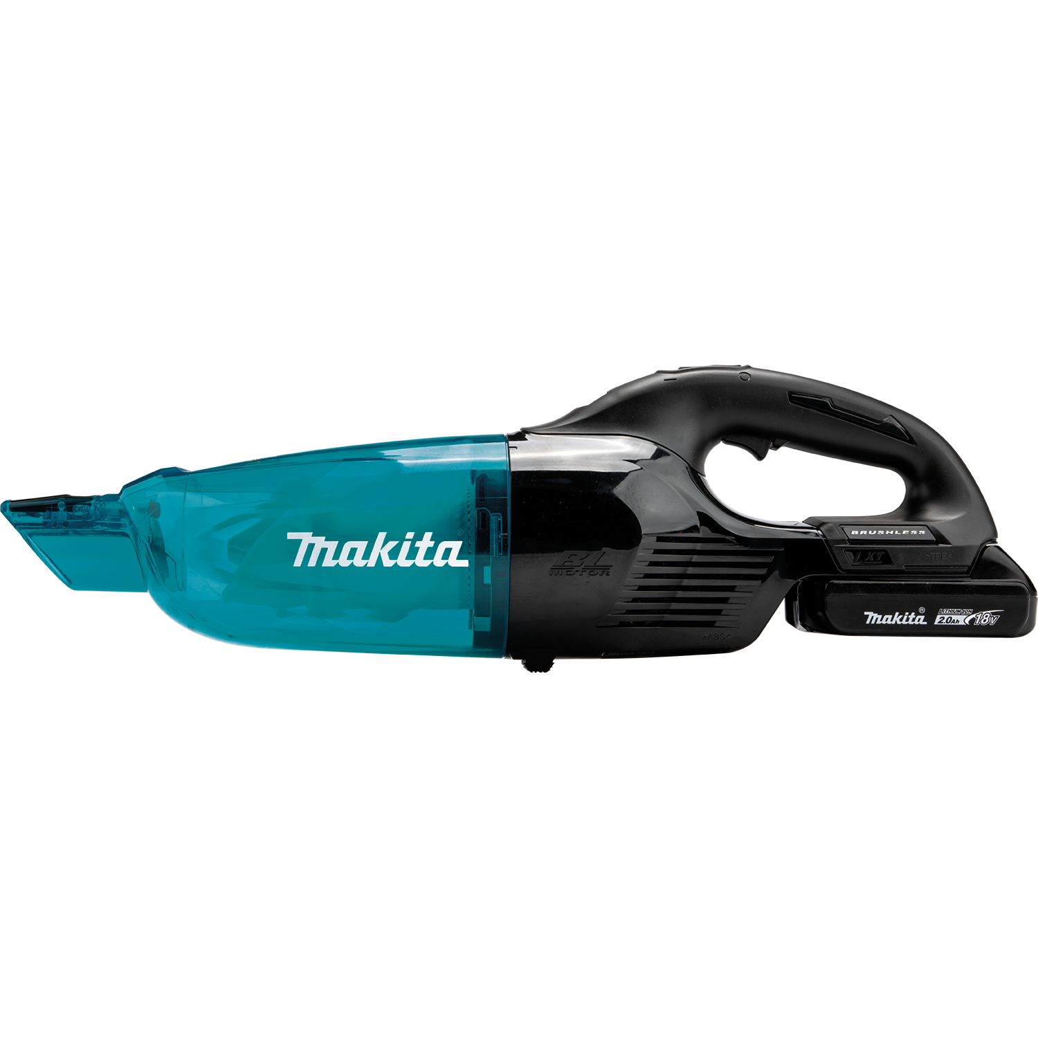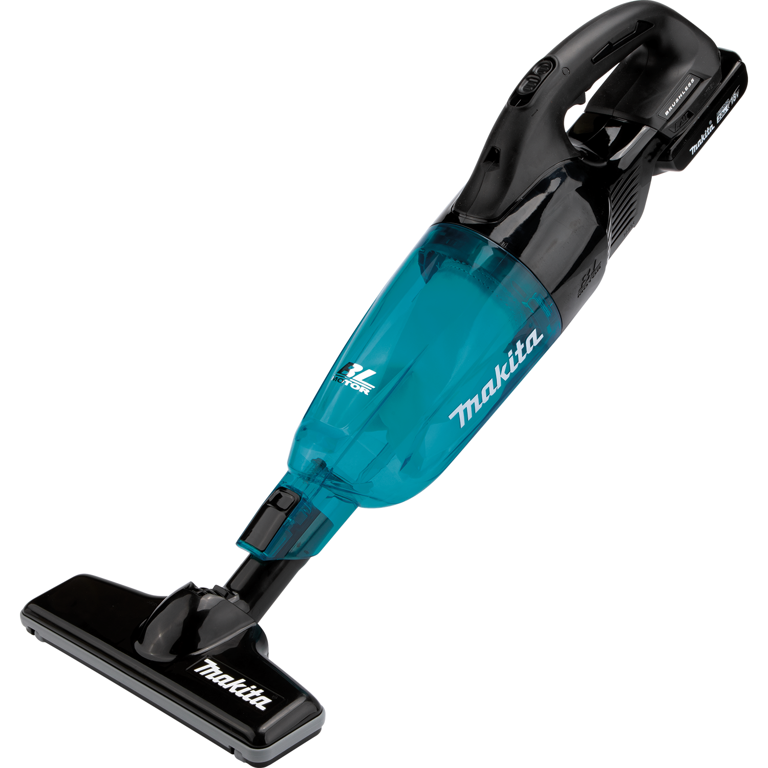 The Makita® 18V LXT® Brushless Cordless Vacuum Kit (XLC03R1BX4) is a compact and powerful cordless vacuum with strong suction for fast and efficient cleaning. The vacuum can be used with trigger mode or slide switch mode for ease and convenience. Compact and ergonomic design for operator comfort and, at 2.7 lbs., is lightweight for reduced operator fatigue. A bagless cloth filtration system allows for easier cleaning and quicker debris disposal. The vacuum and included nozzle and attachment feature the distinctive teal and black trade dress. The XLC03R1BX4 is a kit and includes one fast-charging 18V LXT 2.0Ah lithium-ion battery and efficient Rapid Optimum Charger. The powerful Makita-built motor delivers up to 49 CFM.It’s part of Makita’s expanding 18V LXT® system, the world’s largest cordless tool system powered by 18V lithium-ion batteries. Makita® 18V Lithium-Ion Batteries have the fastest charge times in their categories, so they spend more time working and less time sitting on the charger.For improved tool performance and extended battery life, Makita created Star Protection Computer Controls™. Star Protection is communication technology that allows the Star Protection-equipped tool and battery to exchange data in real time and monitor conditions during use to protect against overloading, over-discharging and overheating. For increased versatility, the tool can also be powered by Makita® 18V LXT® and Compact Lithium-Ion Batteries with the star symbol on the battery indicating Star Protection inside.