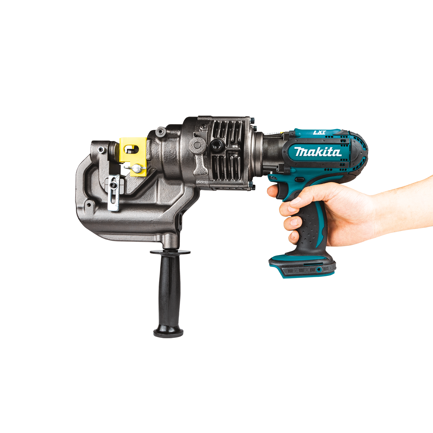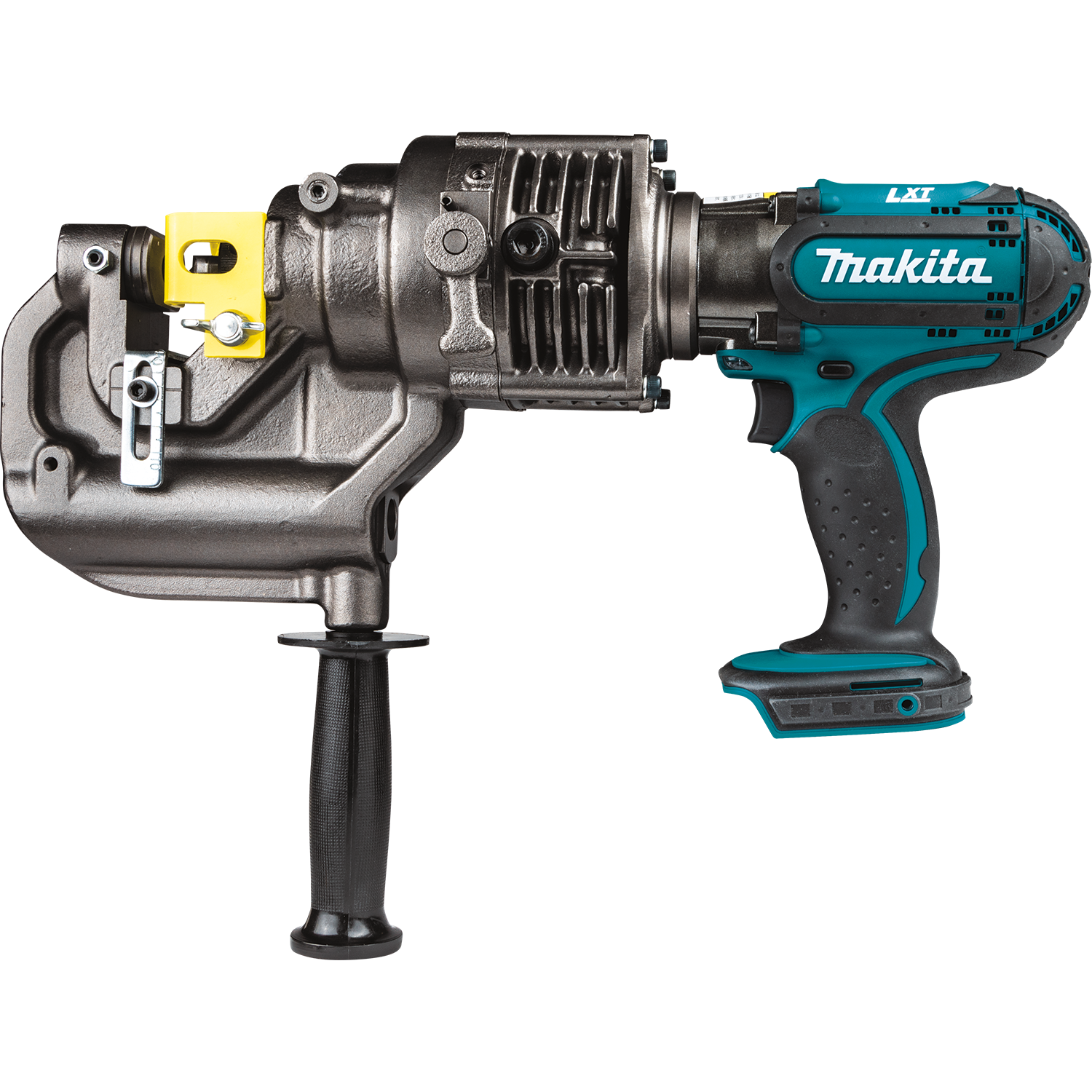 Punch holes in ¼” metal in under 5 seconds with the 18V LXT® Lithium-Ion Cordless 5/16" Hole Puncher, Tool Only (XPP01ZK). The XPP01ZK allows hole punching with complete cordless mobility. It can punch up to 180 20MM (25/32”) diameter holes in 15/64” thick steel with a 5.0Ah 18V LXT Battery (sold separately). The punch stop mechanism automatically retracts the die once a punch is complete to quickly continue operation. For select applications, hole punching just became fast and effortless! The ergonomic grip handle rotates 360°, allowing for optimal positioning in a variety of spaces. It features a rubberized soft grip for increased comfort on the job and a convenient side handle for additional support. The XPP01ZK is ideal for fabrication, HVAC, plumbing, electrical, mechanical and many more applications.It’s part of Makita’s expanding 18V LXT® System, the world’s largest cordless tool system powered by 18V lithium-ion slide-style batteries. Makita® 18V LXT® Lithium-Ion Batteries have the fastest charge times in their categories, so they spend more time working and less time sitting on the charger.For improved tool performance and extended battery life, Makita created Star Protection Computer Controls™. Star Protection is communication technology that allows the Star Protection-equipped tool and battery to exchange data in real time and monitor conditions during use to protect against overloading, over-discharging and overheating. For increased versatility, the tool can also be powered by Makita® 18V LXT® Lithium-Ion Batteries with the star symbol on the battery indicating Star Protection inside.