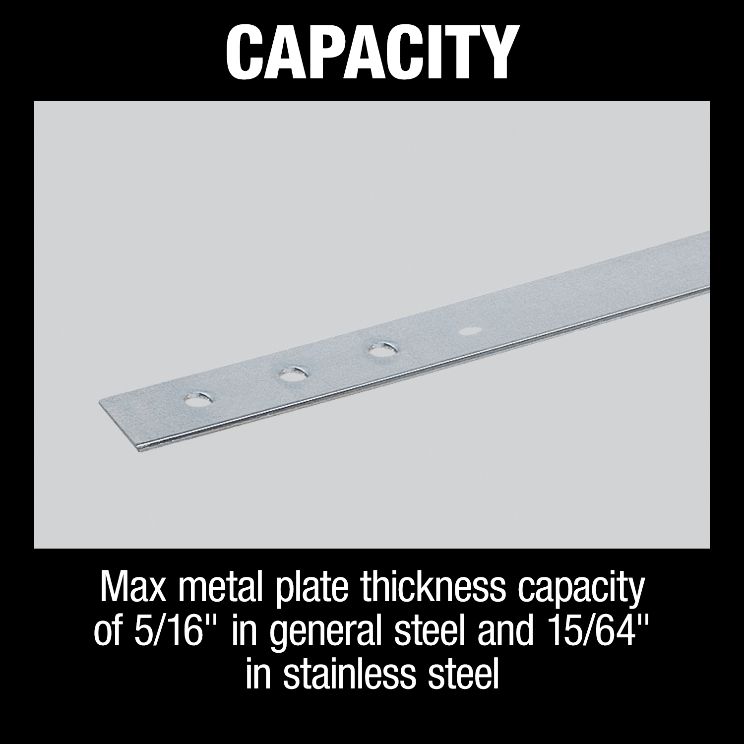 - Max metal plate thickness capacity of 5/16" in general steel and 15/64" in stainless steel