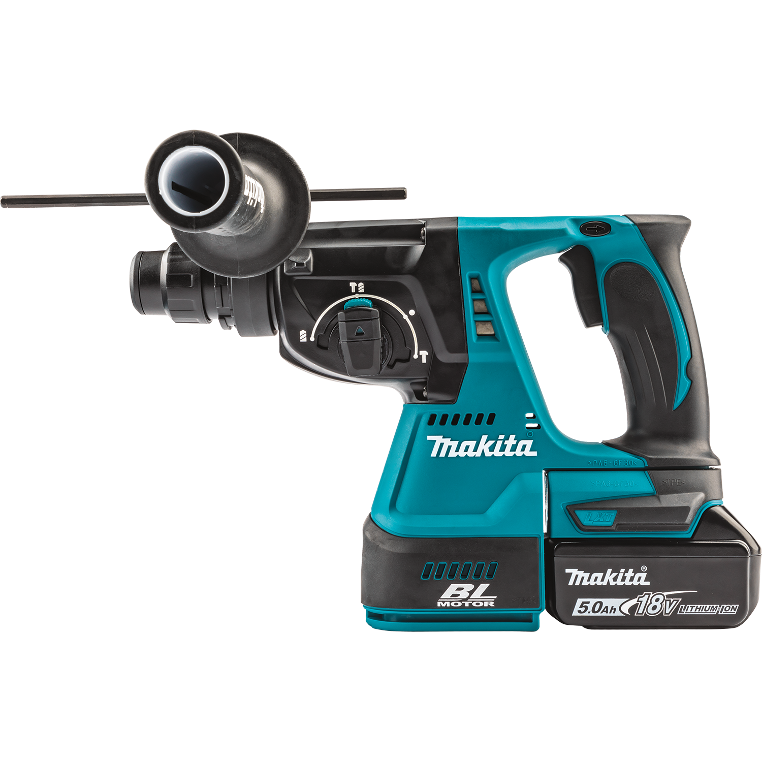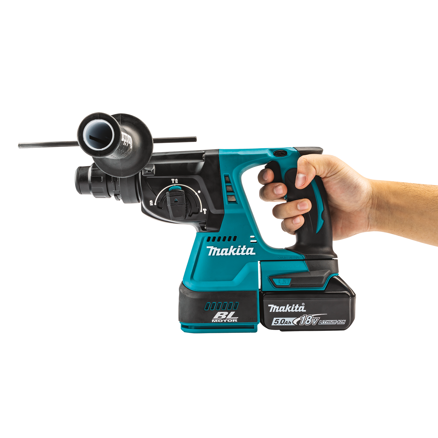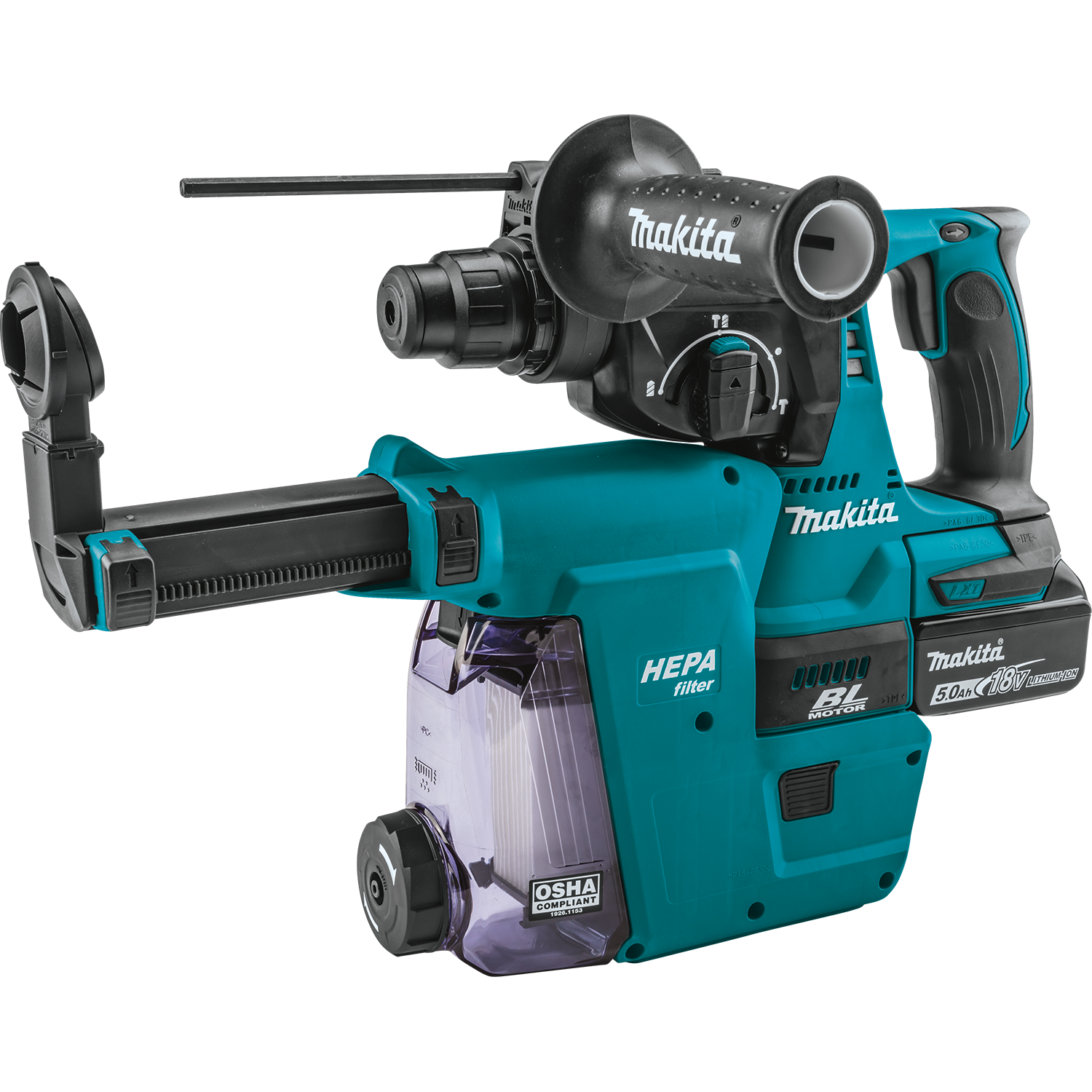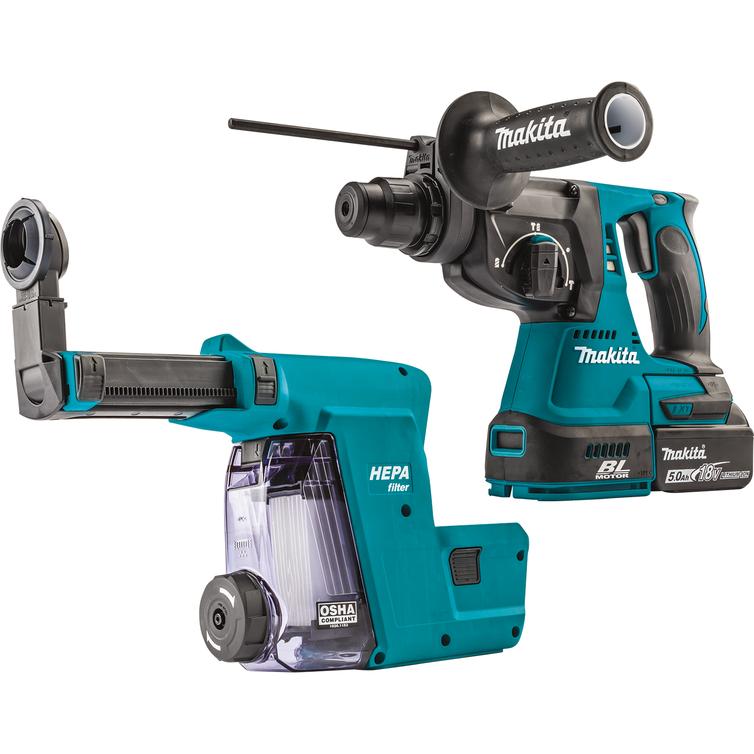 - INCLUDES : (2) 18V LXT® Lithium-Ion 5.0Ah batteries, rapid charger, HEPA dust extractor attachment, side handle, depth gauge, grease, cloth and tool bag
