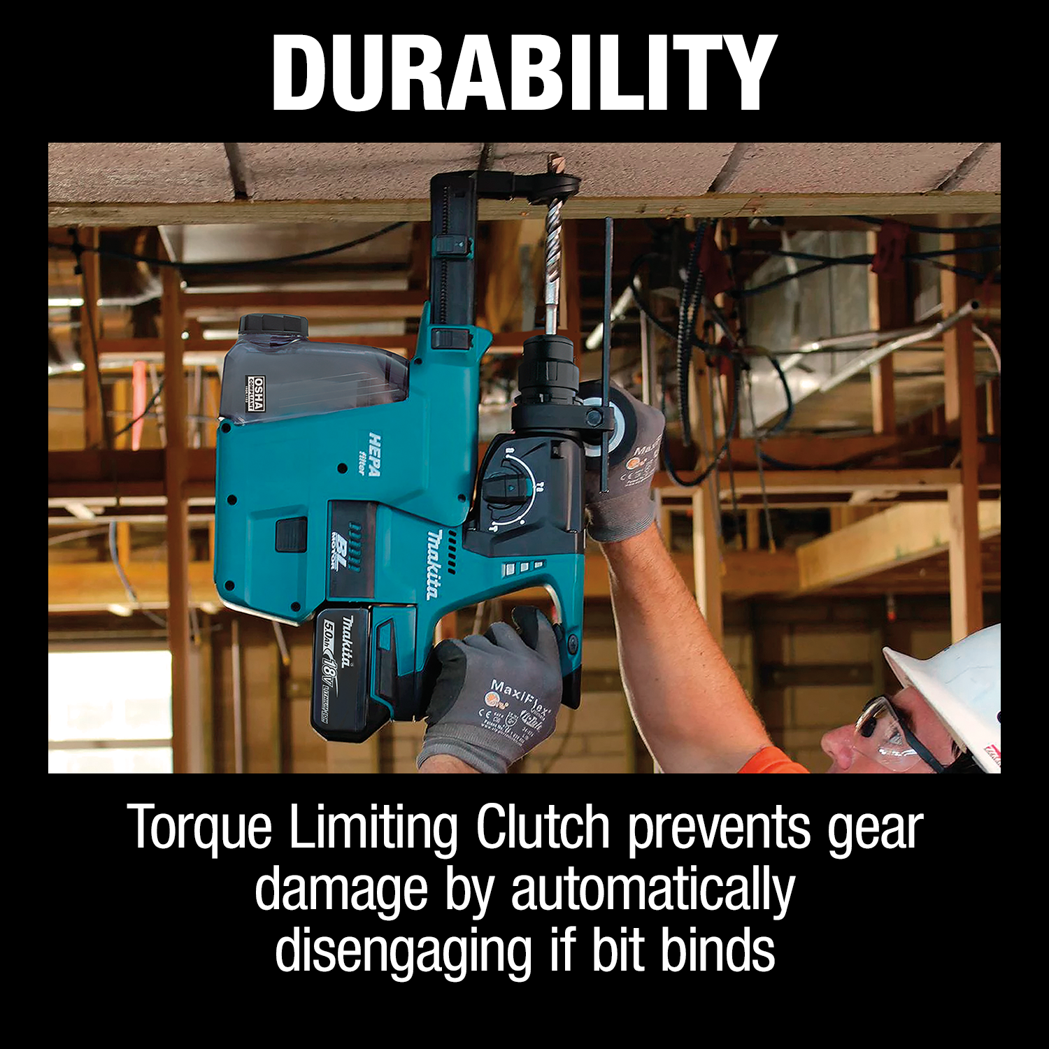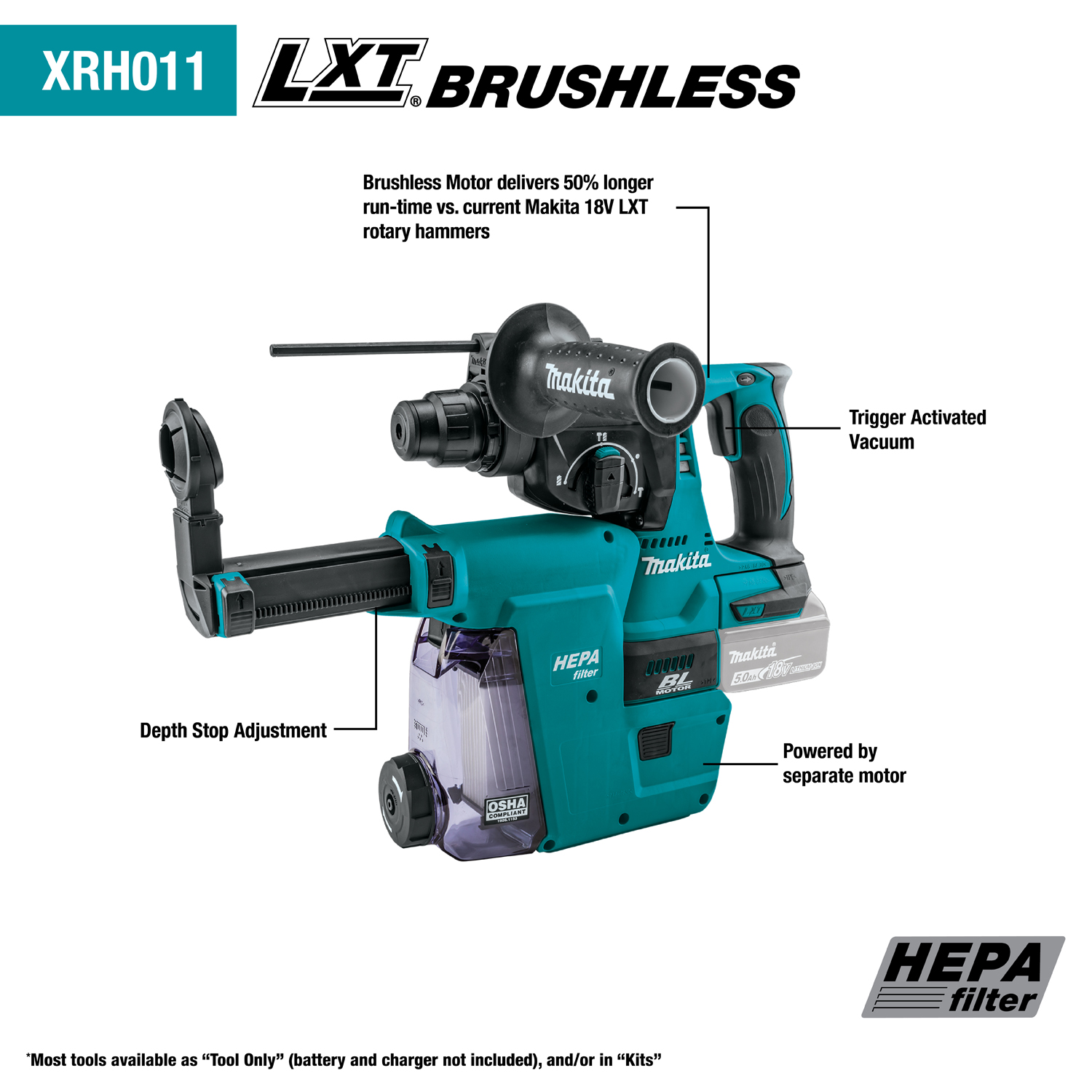 The 18V LXT® Brushless Cordless 1” Rotary Hammer with HEPA Dust Extractor (XRH011TWX) is a cordless concrete drilling solution powered by an efficient Makita-built brushless motor for up to 50% longer run time, increased power and speed, and longer tool life. The XRH011TWX delivers 0-950 RPM, 4,700 BPM, and 1.7 ft.lbs of impact energy. The HEPA Dust Extractor Attachment is trigger-activated for user convenience. The rubber suction gasket is engineered to provide consistent contact with the work surface, where the dust is channeled to the clear dust container with HEPA filter, which captures 99.97% of dust particles (size .3 microns). An added feature is a 2-second delay on the vacuum motor: After the trigger is released, the 2-second extended suction collects remnant dust and particles as the bit is being pulled out of the work surface, making the XRH011TWX ideal for overhead drilling.The high capacity dust container is clear and provides an accurate level indicator of collected material. The container also has the largest material holding capacity in its class with faster and more convenient disposal of material than leading competitor models for less downtime. It has a quick release and can be easily detached from the rotary hammer when not needed. Multiple chisel positions align the rotary hammer more comfortable with the application. A torque-limiting clutch prevents gear damage by disengaging gears if the bit binds. A variable speed trigger enables the user to match speed to the application. It’s part of Makita’s expanding 18V LXT System, the world’s largest cordless tool system powered by 18V lithium-ion slide-style batteries. Makita® 18V LXT Lithium-Ion Batteries have the fastest charge times in their categories, so they spend more time working and less time sitting on the charger.For improved tool performance and extended battery life, Makita created Star Protection Computer Controls™. Star Protection is communication technology that allows the Star Protection-equipped tool and battery to exchange data in real time and monitor conditions during use to protect against overloading, over-discharging and overheating. For increased versatility, the tool can also be powered by Makita 18V LXT Lithium-Ion Batteries with the star symbol on the battery indicating Star Protection inside.