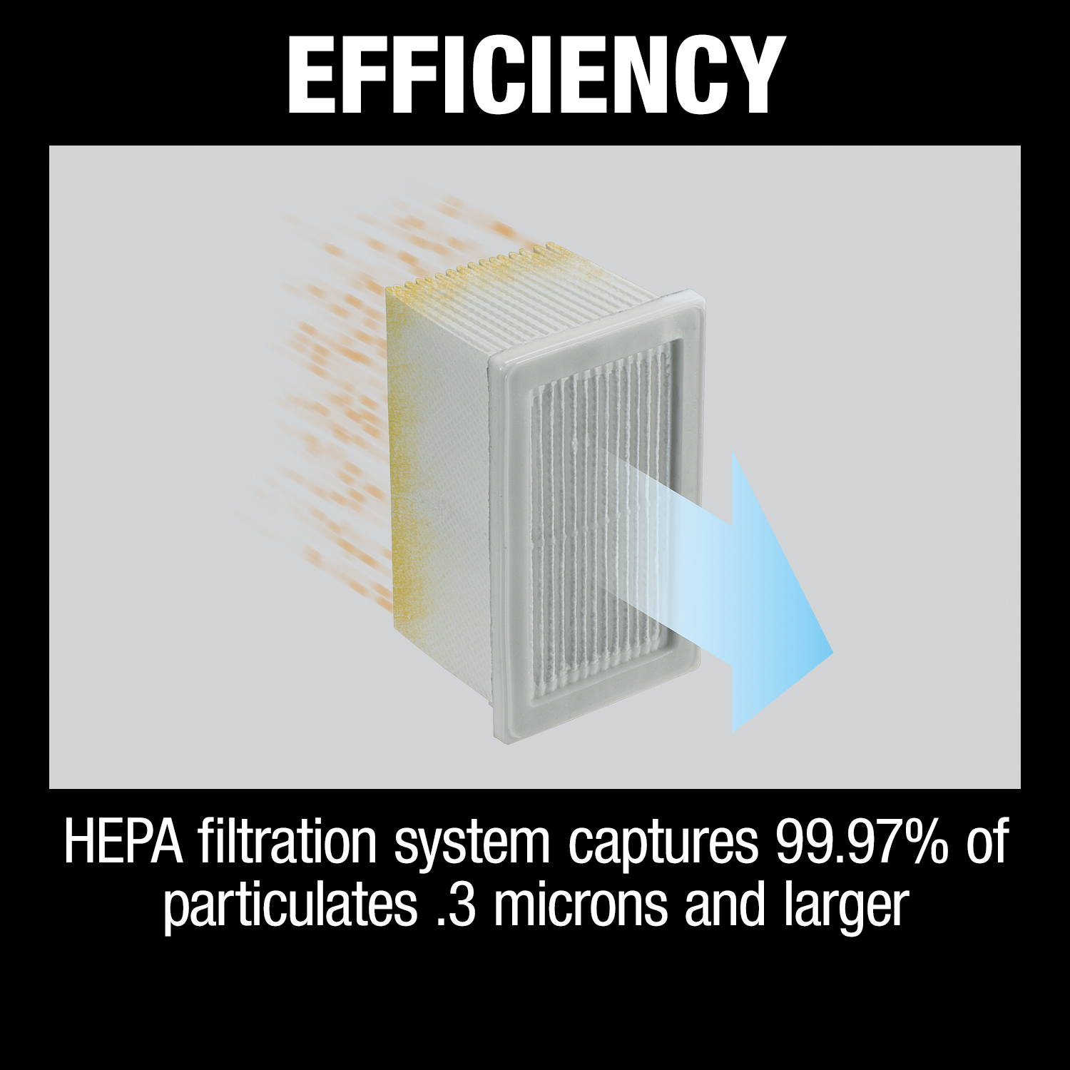 - EFFICIENCY : HEPA filtration system captures 99.97% of particulates .3 microns and larger
