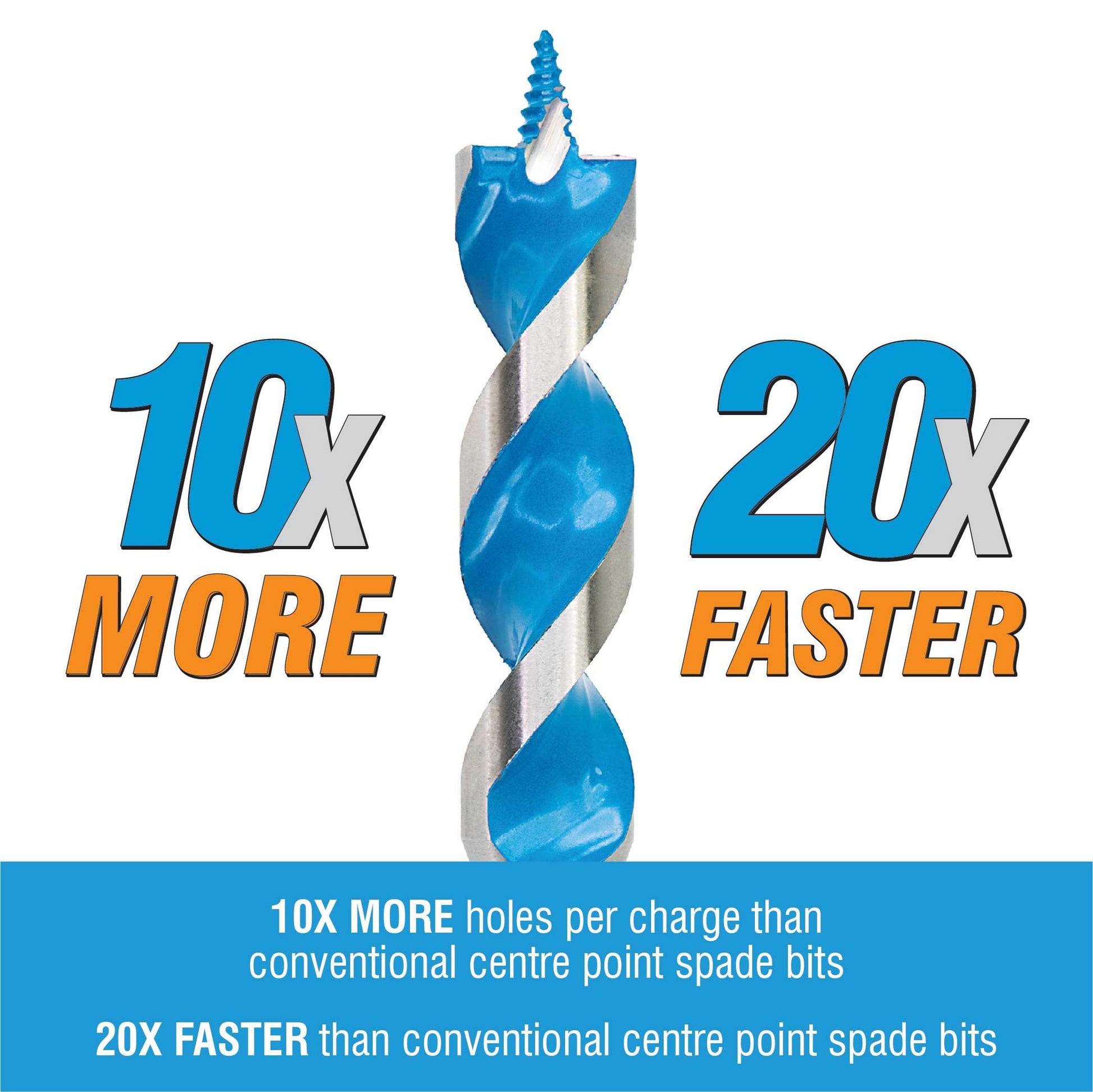 - 20X faster and 10X more holes per charge than conventional spade bits