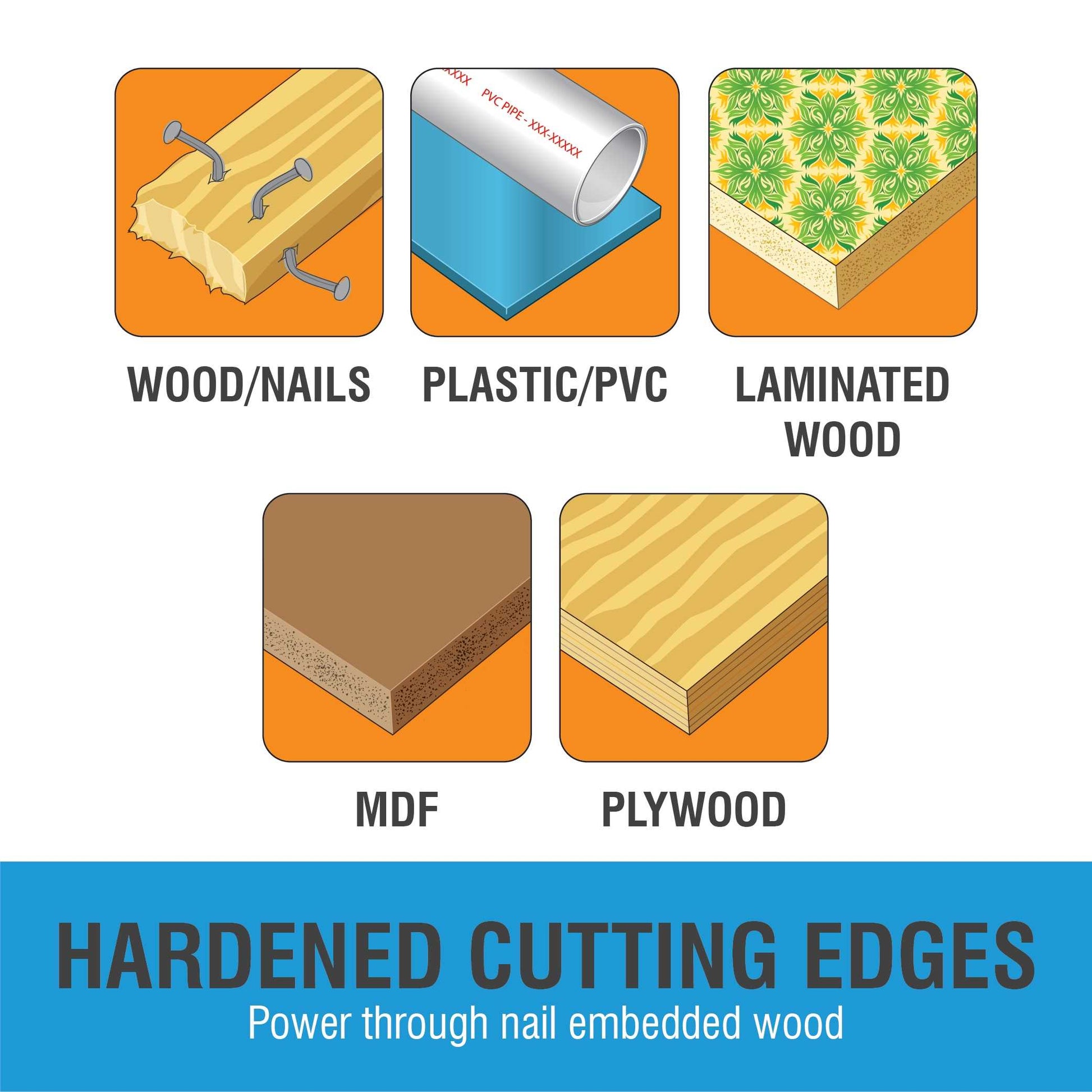 - Ideal for use on soft and hard woods, wood with nails, plastic/PVC, plywood, laminated wood, MDF, and particle board