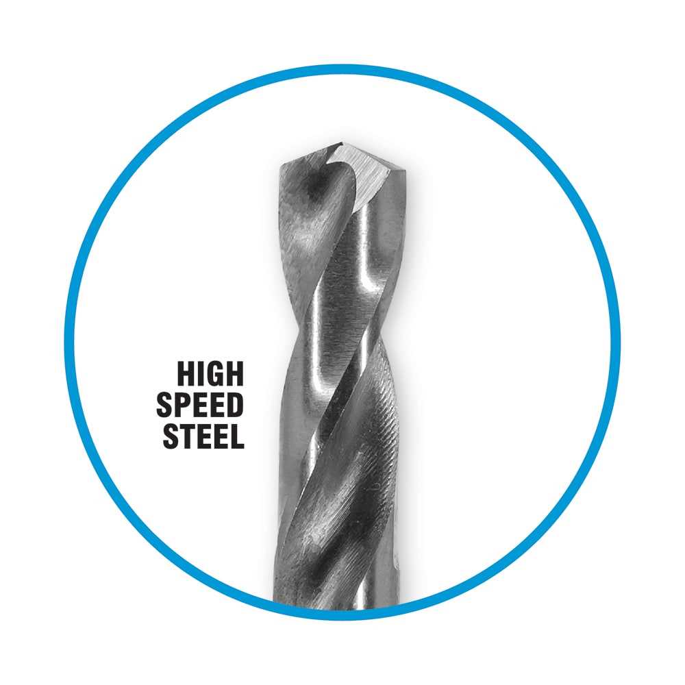 - High speed steel (HSS) pilot bit drills wood, metal and plastics