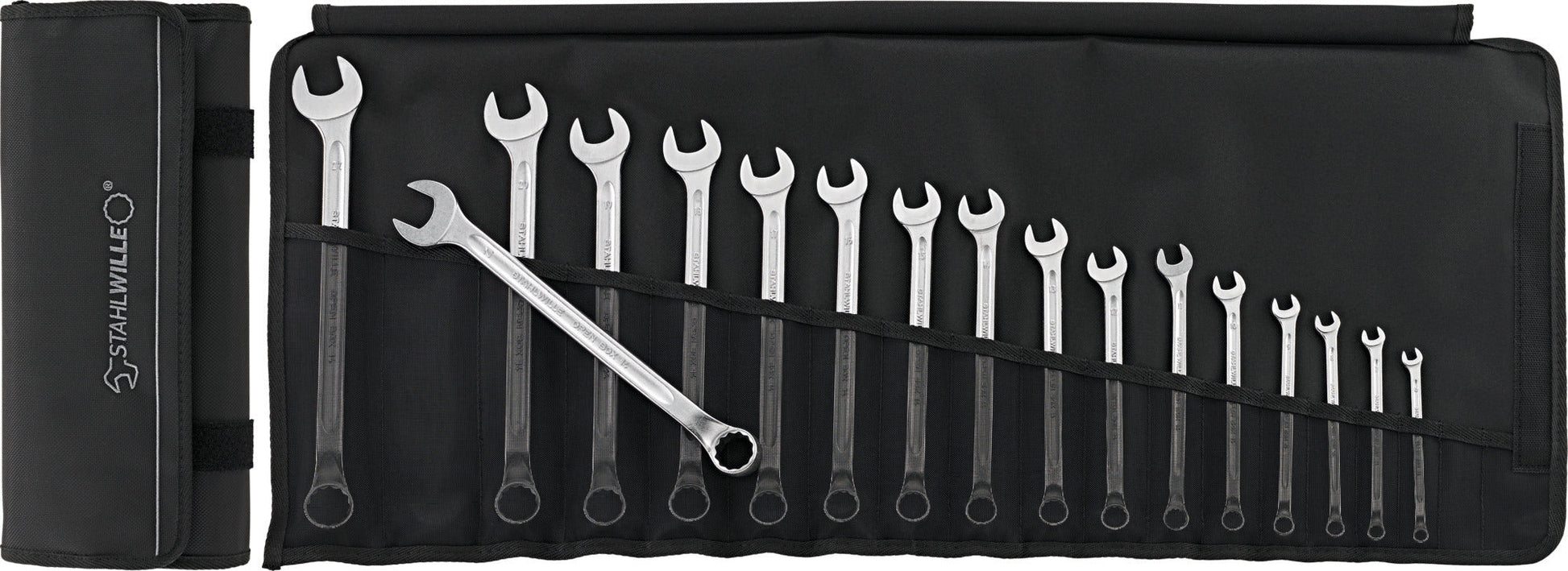 - Made in Germany - Combination spanner set in sturdy roll-up case, 17 pcs.-pce., 6-22 mm, ring side 15° angled, DIN 3113 Form B / ISO 7738 Form B, .